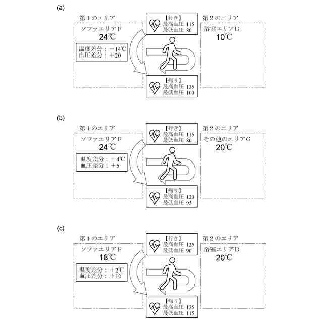 即ち、請求項1においては、複数のエリアを有する建物内の対象者の健康リスクを推定する健康リスク推定システムであって、前記対象者のエリア間の移動を検知する移動検知部と、移動先のエリアにおける前記対象者の行動を推定可能な行動推定部と、移動前のエリアの温度である第1の温度及び前記移動先のエリアの温度である第2の温度を検出する温度検出部と、前記対象者が前記移動前のエリアにいたときの前記対象者の血圧値である第1の血圧値、及び前記対象者が前記移動先のエリアから前記移動前のエリアに帰ってきたときの前記対象者の血圧値である第2の血圧値を検出する血圧検出部と、前記行動推定部によって推定される前記行動ごとに、前記第2の温度と前記第1の温度との差である温度差分と、前記第2の血圧値と前記第1の血圧値との差である血圧差分と、の関係を示す温度血圧データを取得する温度血圧データ取得部と、第一の期間における前記温度血圧データである第一温度血圧データと、前記第一の期間よりも過去のものであって、前記第一温度血圧データの前記行動と同様な行動の前記温度血圧データである第二温度血圧データと、の比較結果に基づいて前記対象者の健康リスクを推定可能な健康リスク推定部と、を具備するものである。