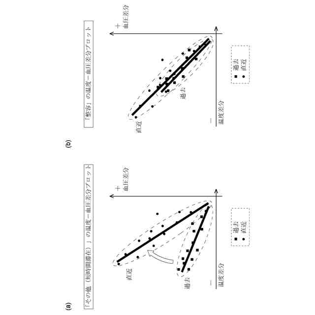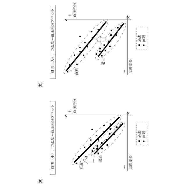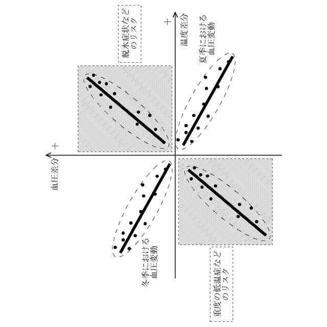 請求項2においては、前記温度血圧データ取得部は、前記温度差分と前記血圧差分とをグラフにプロットし、プロットされた各点に基づいて回帰直線を算出することによって、前記温度血圧データを取得し、前記健康リスク推定部は、前記第一温度血圧データの前記回帰直線と前記第二温度血圧データの前記回帰直線との比較結果に基づいて、前記対象者の健康リスクを推定可能であるものである。
