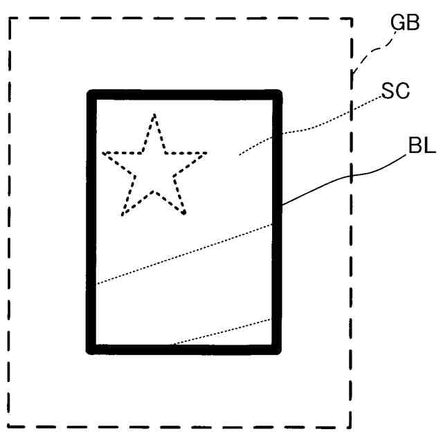 プロジェクター10は、映像生成器20から供給される画像データの表す投写画像GAを、投写対象SCが配置される投写領域SRに投写することによりプロジェクションマッピングを実現する。本実施形態における投写対象SCは例えばポスターであり、投写領域SRは、システム1を利用するユーザーの居室の壁面の一つであって、投写対象SCは当該壁面に貼り付けられている。本実施形態では、上述のプロジェクションマッピングにより、図2に示されるように、投写対象SCの周囲に仮想的な額縁VWを付与する投写画像GAが投写される。なお、図2では、投写対象SCは点線で描画されている。投写対象SCが貼り付けられた壁面を有する居室は本開示における現実空間の一例であり、仮想的な額縁VWを表す投写画像GAは本開示における第1投写画像の一例である。仮想的な額縁VWは、本開示におけるコンテンツの一例である。また、本実施形態における投写対象SCは、ポスターであるが、絵画、イラスト、又は写真であってもよく、投写領域SRに貼り付けられたマーカー又はテープ等であってもよい。なお、本開示における投写対象SCは、ポスター等の二次元的なオブジェクトには限定されず、三次元形状を有する立体的なオブジェクトであってもよい。