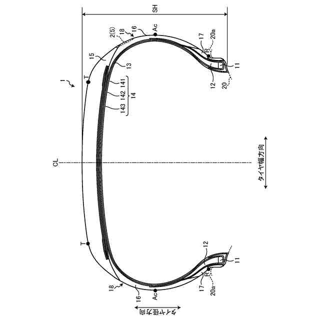 図1は、実施形態に係る空気入りタイヤのタイヤ子午線方向の断面図である。図1では、リム20に装着された空気入りタイヤ1のタイヤ径方向の片側領域の断面図を示している。実施形態では、タイヤの一例として、空気入りタイヤであって、乗用車用空気入りラジアルタイヤについて説明する。