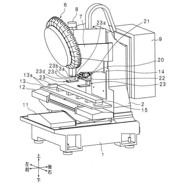 本開示においては、保持部又は主軸ヘッドの移動可能な範囲を超えたワークの部分に加工する場合、支持部及び第二移動機構によってワークは上に移動し、第一移動機構によって、保持部又は主軸ヘッドが上下方向に交差する方向に移動し、支持部及び第二移動機構によってワークは下に移動し、保持部は、工具による加工が可能な位置にワークを保持する。