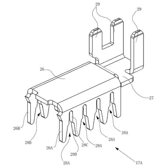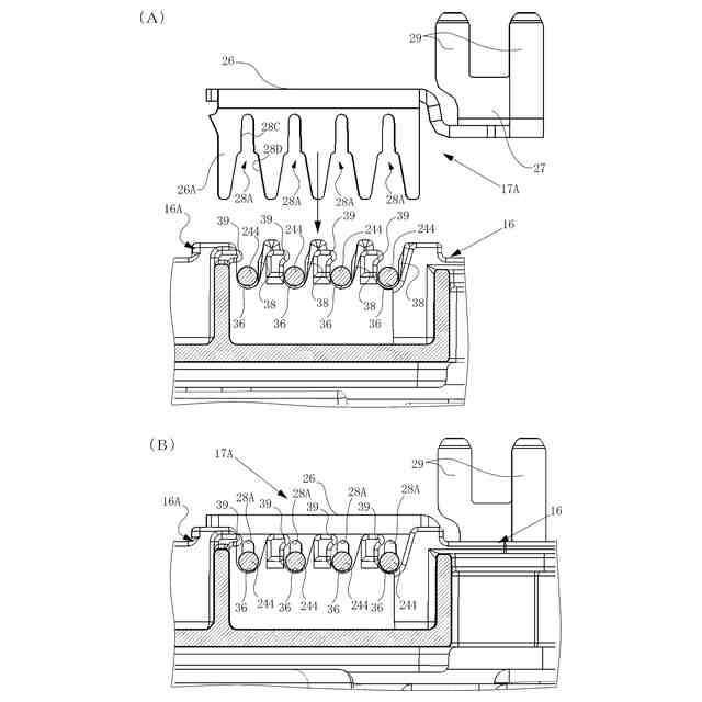 ターミナルホルダのガイド溝には、リード部を仮保持するため、リブが両側又は片側に形成されている。リード部は、リブとリブとの間、又はガイド溝の側面とリブとの間に圧入されることによりガイド溝に仮保持される。