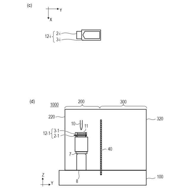 図1Aに示す光学測定装置に好適に用いられる枠付きアレイプレートの構造を示す模式図(c)と、反応室載置部に載置されたアレイプレートとピペットチップとの位置関係を示す模式図(d)である。