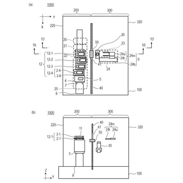 本発明の光学測定装置の構造の一例を模式的に示す2面図(a)(b)である。