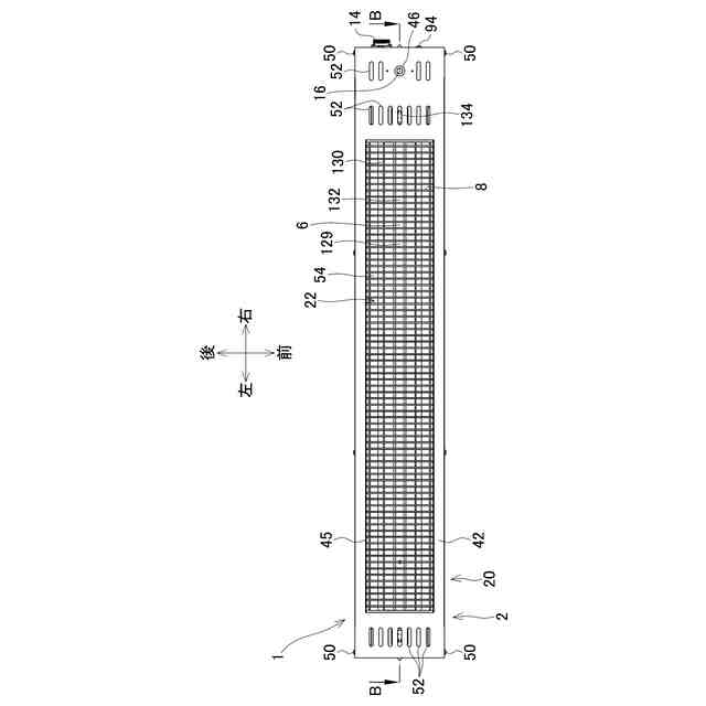 図1は、本発明に係る暖房装置1における後面、右面及び上面側の斜視図である。図2は、暖房装置1における前面、左面及び下面側の斜視図である。図3は、暖房装置1の後面図である。図4は、暖房装置1の下面図である。図5は、図4のB-B線断面図である。図6は、図3のA-A線断面図である。