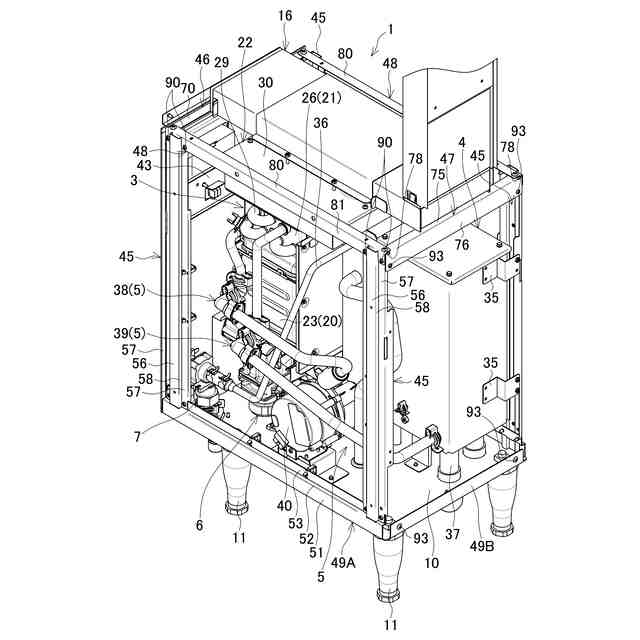 筐体2は、平面視矩形状の底板10の上方にフレーム構造を形成して前後方向に延びる直方体となっている。底板10は、下面に設けた脚11,11・・によって水平に支持される。筐体2の上面には天板12が設けられると共に、前後左右には、前パネル13、後パネル14、左右の側パネル15,15が設けられて各面が閉塞されている。天板12上には、排気ダクト16が設けられている。前パネル13には、上側に操作部17が、下側に給気部18がそれぞれ設けられている。筐体2内に、熱源ユニット3、タンク4、内部循環路5、ガス供給部6、注水部7、コントローラ8が収容されている。筐体2の詳細については後述する。