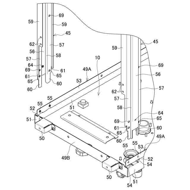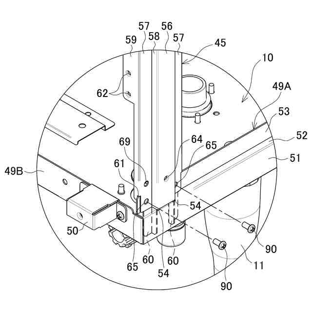 【解決手段】各縦フレーム45は、段部52上で内立上げ部53に沿って延びる前後幅を有して上下方向に立設される帯状板で、前後両端で内立上げ部53の外面にネジ止めされる内側平面部57,57と、内側平面部57,57の間で左右外側へ突出し、側パネル15がネジ止めされる外側平面部56と、各内側平面部57,57と外側平面部56とを連結する一対の連結面部58,58とを有し、各内側平面部57と各連結面部58との下端には、外側平面部56よりも下方に突出する差込部60がそれぞれ形成されている。そして、各段部52には、各縦フレーム45の取付位置で各差込部60が差し込まれるL字スリット54がそれぞれ形成されている。