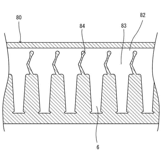 周方向に隣り合うティース部の基端側の間に、内周側の端面から径方向外方に延びる切れ目を有し、