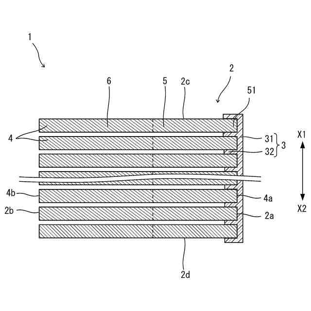 前記積層体の外周面上を、前記積層体の積層方向一側の端面位置から積層方向他側の端面位置まで前記積層方向に延びていて、