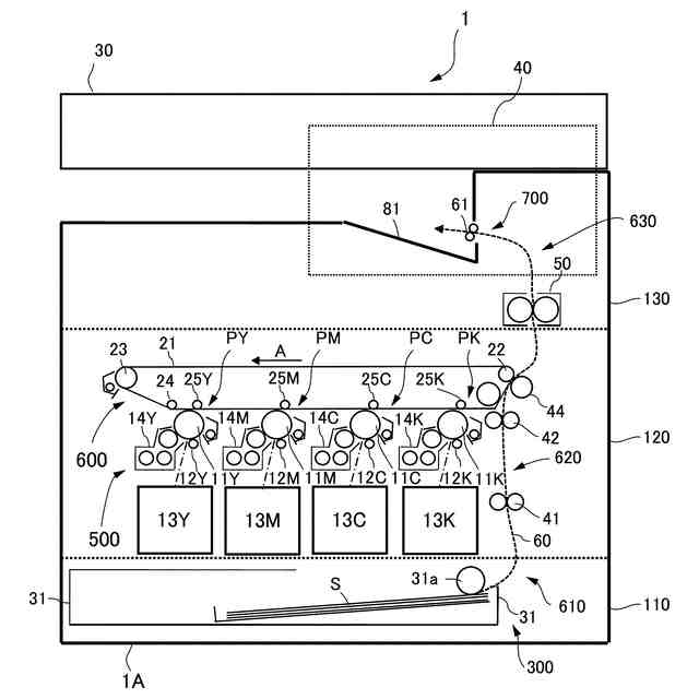 図1に示す画像形成装置1は、中間転写方式のフルカラープリンタである。イエロー(Y)、マゼンタ(M)、シアン(C)、ブラック(K)のトナー像を形成する4色の画像形成部PY、PM、PC、PKは、中間転写ベルト21に対向されて配置される。画像形成装置1は、画像形成ユニット500を備える。画像形成ユニット500は、原稿読取ユニット30あるいはパーソナルコンピュータ等の外部端末等(不図示)から受信した画像信号に基づきトナー像を記録材Sに形成する。画像形成ユニット500は、画像形成部PY、PM、PC、PK及び中間転写体ユニット600を有している。