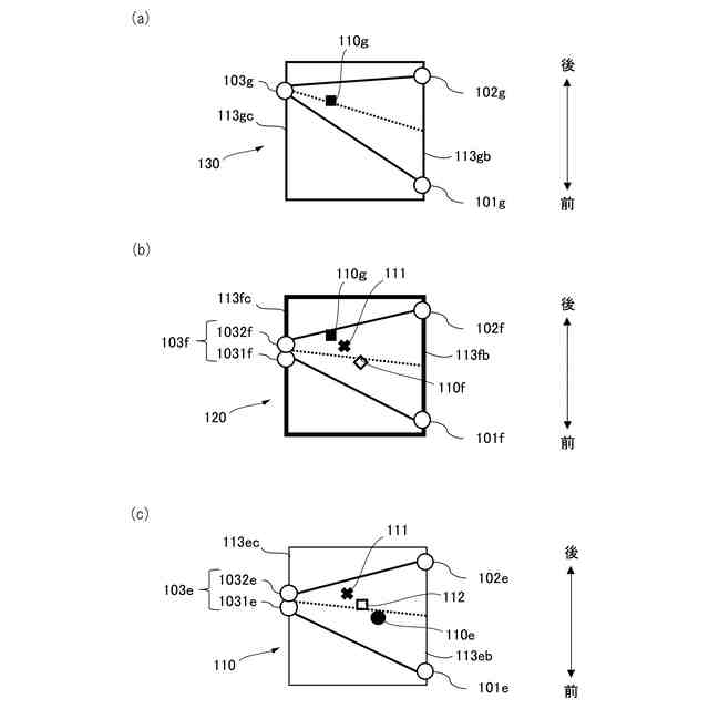 (a)排出ブロックにおける支持点の位置関係を示す模式図、(b)作像ブロックにおける支持点の位置関係を示す模式図、(c)供給ブロックにおける支持点の位置関係を示す模式図。