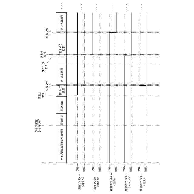 前記特定条件は、前記演者アバターの動作に係わる処理負荷の条件である(例えば、図46に示すように、第1演目期間や第2演目期間の開始により演者アバターの動作が大きく(激しく)なることで仮想空間の更新処理負荷や演者アバターの描画処理負荷が増大することに対応した条件)、