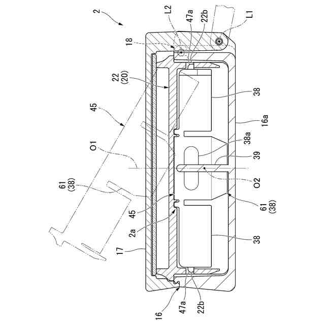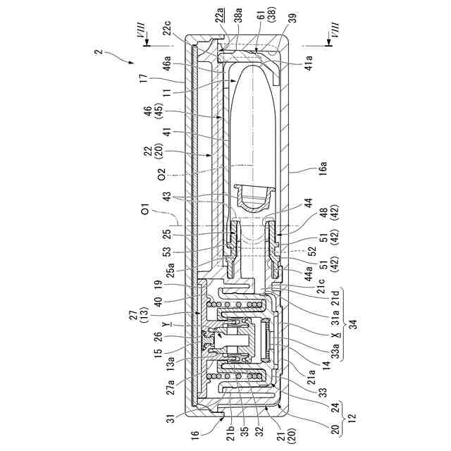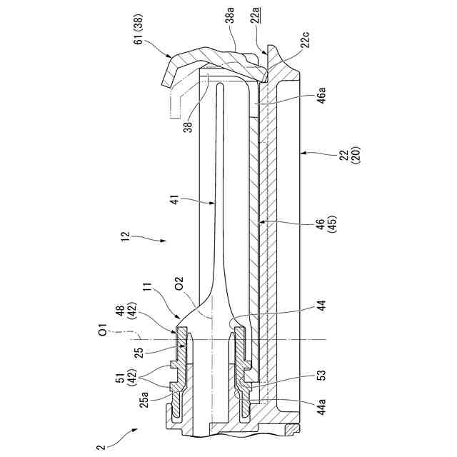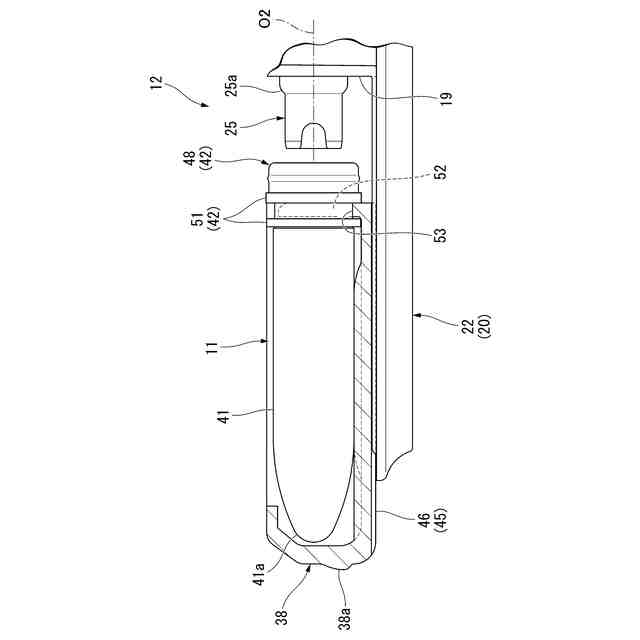 前記軸方向から見て前記中心軸線は前記押込み突起上に位置し、前記被押込み壁部には、前記軸方向に沿う前記口部材側と反対側に向けて突出する突起が形成され、前記中枠部材が前記外枠部材に収容されるときに、前記突起が前記押込み突起を摺動してもよい。
