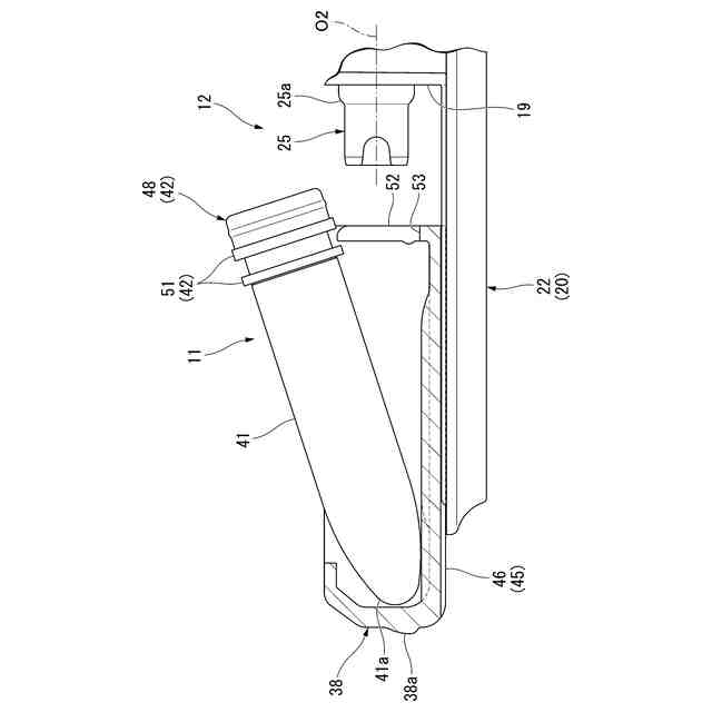 次に、新たなレフィル容器の口部材をスライダに係止した後に、スライダを軸方向に沿う連結筒部側に向けてスライド移動させ、口部材を連結筒部に連結する。そして、中枠部材をヒンジ部回りに回転させて外枠部材に収容する。
