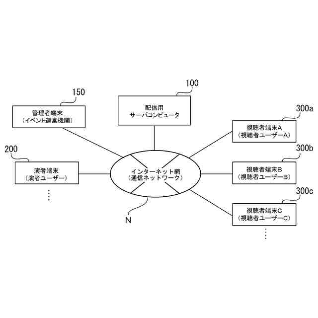 前記視聴者ユーザー端末に通信ネットワークを介して接続され、少なくとも前記仮想空間に関する処理と前記仮想空間コンテンツの配信に関する処理とを実行可能なサーバコンピュータ(例えば、配信用サーバコンピュータ100)と、