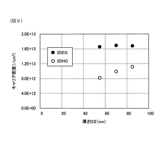 厚さD2と2DEGおよび2DHGのキャリア濃度の関係を示したグラフ。