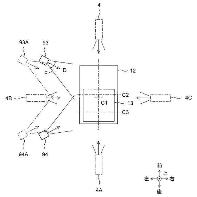 前記第2アーム部の前端部に前記前部カメラが配置され、前記第2アーム部の後端部に前記後部カメラが配置される