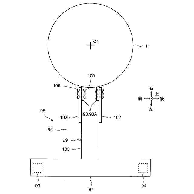 前記アームは、平面視でT字状に形成され、前記基部から側方に延びる第1アーム部と、前記第1アーム部の先端部から前方および後方に延びる第2アーム部とを備え、