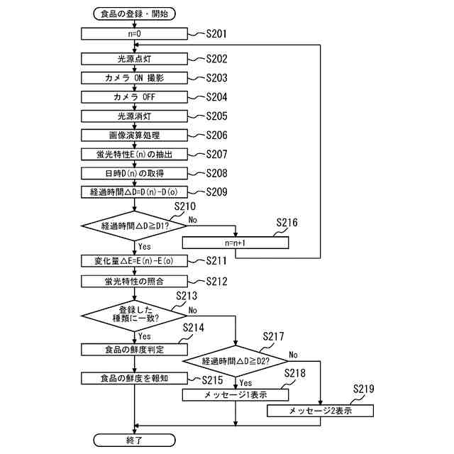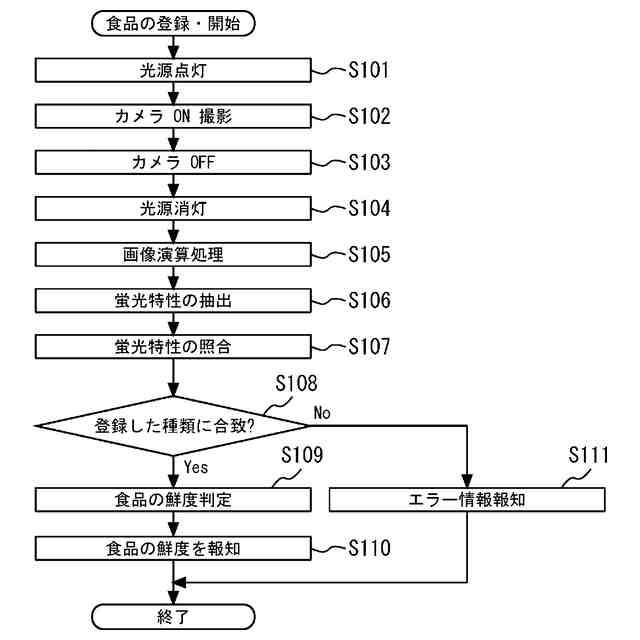 【解決手段】冷蔵庫は、食品が収納される貯蔵室が形成された冷蔵庫本体と、貯蔵室内の食品に、当該食品の蛍光を励起可能な特定波長の光を照射する光照射手段と、貯蔵室内の食品が発する蛍光の波長の光を検出する光検出手段と、光照射手段による特定波長の光の照射時に、貯蔵室内の食品が発する蛍光の波長の光が光検出手段により検出されない場合、ユーザに報知を行うための報知信号を出力する報知制御手段と、を備える。