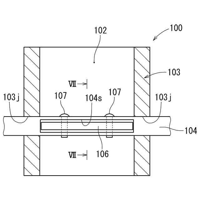 スロットルシャフト104には、図6、図7に示すように、スロットルバルブ106が挿入されるバルブ挿入スリット104sが径方向に貫通した状態で形成されている。さらに、バルブ挿入スリット104sの両開口部の位置には、図7に示すように、先端が尖ったトゲ状の突片104tが形成されている。そして、バルブ挿入スリット104sに挿入されたスロットルバルブ106がスクリュー107によりスロットルシャフト104に固定される。このとき、バルブ挿入スリット104sの両開口部の突片104tがスロットルバルブ106の表面、及び裏面に食い込むため、スロットルシャフト104に対するスロットルバルブ106の位置ずれを防止できる。ここで、トゲ状の突片104tは、切削加工の際のバリ等が好適に活用される。