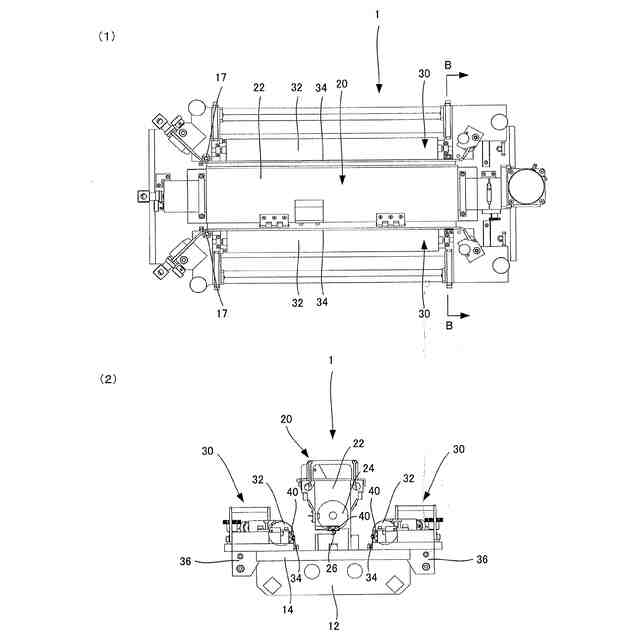このような放電線26,34はローラに接触させずに、数ミリ、具体的には1mmの距離を開けて近接している。そして放電線26,34は、導体を絶縁体で被膜した可撓性のワイヤーであり、プラグ式ケーブルを介して高圧トランス及び商用電源に接続して、高圧トランスで昇圧された7kVの電圧が掛かっている。散布ローラ24によって下方へ運ばれてきた粉体は放電線26からの放電により遊離させる。その際、飛散防止ローラ32に付着した粉体は放電線34からの放電により遊離させて飛散防止ローラ32の下方を移動するプラスチックフィルムやゴムシートなどの散布対象物の上面に粉体を散布できる。