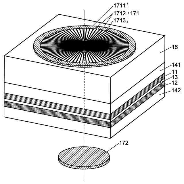 【解決手段】活性層に平行に設けられた、板状の母材内に母材とは屈折率が異なる異屈折率領域が周期的に2次元状に配置された2次元フォトニック結晶層と、活性層及び2次元フォトニック結晶層を厚さ方向に挟むように設けられた第1電極171及び第2電極とを備え、第1電極171が、導電体製の板材から成る窓枠部1711と、窓枠部1711の内側に設けられた窓部1713と、導電体製の線状の部材から成り窓枠部1711から窓部3内の所定の集束点1714に向かって放射状に、窓枠部1711と集束点1714の間又は集束点1714に位置する終端部1715まで延びている複数の線状電極部1712とを有し、線状電極部1712の幅が窓枠部1711から終端部1715に向かって変化している2次元フォトニック結晶レーザ。