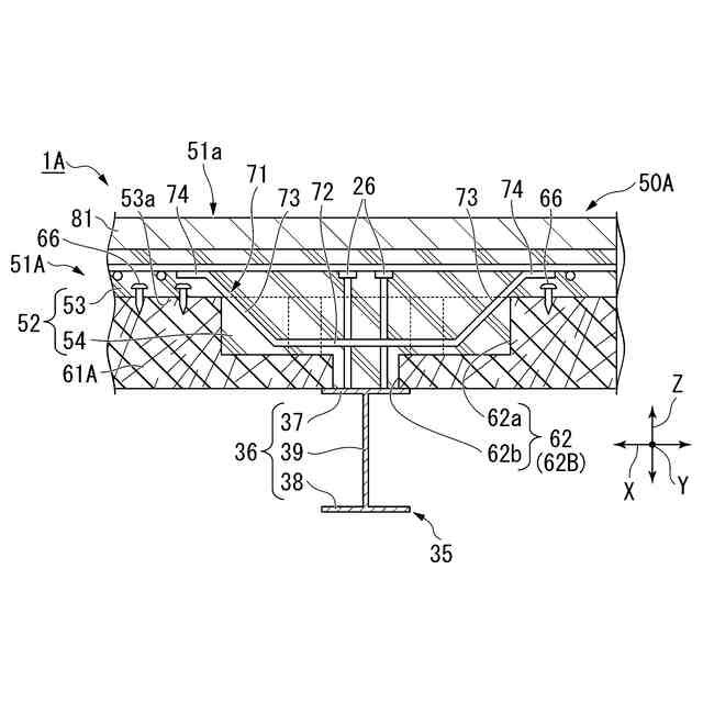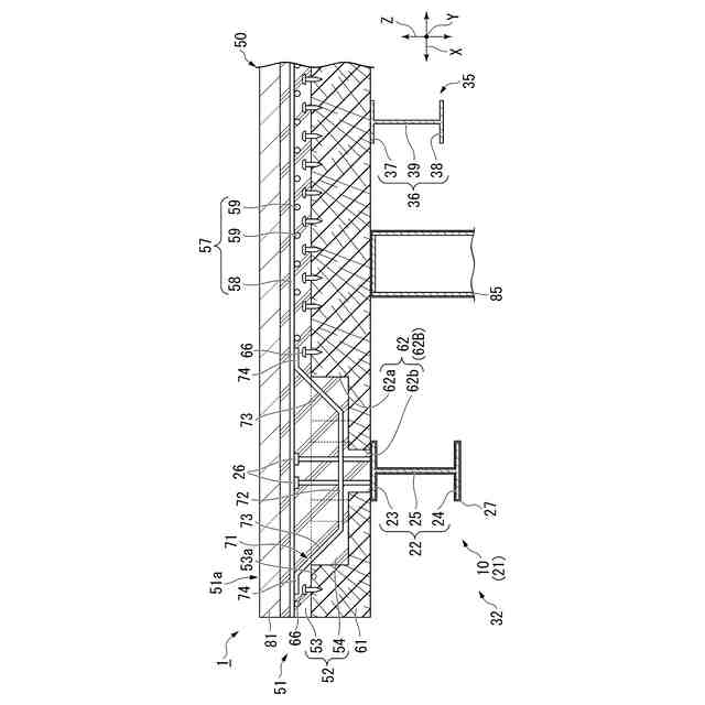 スラブは、平板状である。スラブは、大梁及び小梁に支持されている。大梁及び小梁には、水平鋼板が跨って接合されている。