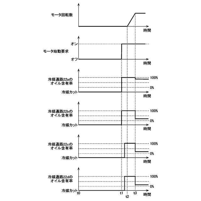 本発明において、好ましくは、制御装置は、モータの動作中において、上記1つ以上の冷媒通路からのオイルの含有率が、他の冷媒通路からのオイルの含有率よりも大きくなるように、複数のオイル含有率調整バルブのそれぞれを制御するように構成されている。