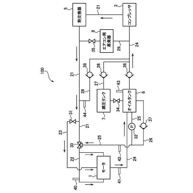 従来から、エアコンなどで利用される冷凍サイクルにおいて、コンプレッサや熱交換器などを介して、冷媒を循環する冷媒循環システムが用いられている。この種の冷媒循環システムでは、一般的に、コンプレッサの潤滑やシールのためにオイル(冷凍機油)を含有する冷媒が用いられており、このオイルもシステム内を循環している。例えば、特許文献1には、システムの始動時に、コンプレッサから吐出されたオイルを含む冷媒を分離してオイルを取り出し、コンプレッサの吸入側にオイルのみを供給することで、コンプレッサを十分に潤滑させるようにした技術が開示されている。