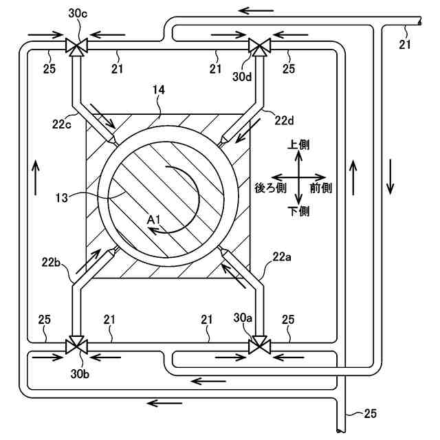 本発明において、好ましくは、冷媒通路は、軸方向に沿って複数設けられていると共に、滑り軸受において周方向に沿って複数設けられている。