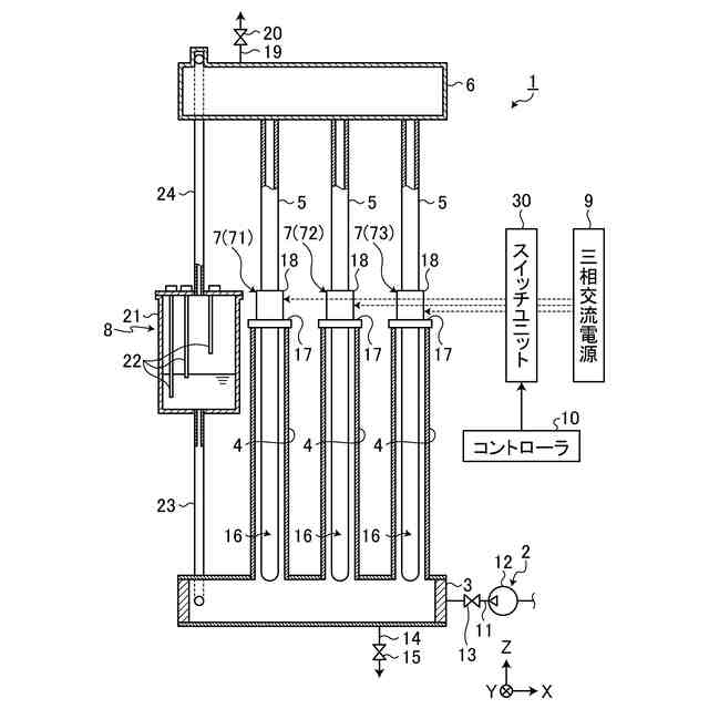 また、電気ヒータが3つのヒータエレメントを有する三相ヒータである場合、3つのヒータエレメントは、相互にスター結線又はデルタ結線される。三相交流電源から三相ヒータに三相の交流電力が供給されることにより、三相ヒータの出力は100%になる。三相交流電源から三相ヒータに単相の交流電力が供給されることにより、三相ヒータの出力は低減される。すなわち、三相ヒータに供給される交流電力が三相又は単相に切り換えられることにより、貫流ボイラの負荷率が多位置化される。しかし、三相交流電源から三相ヒータに単相の交流電力を供給する場合、特定の相のヒータエレメントに負荷か偏る不平衡負荷となるため、内線規程のような規格に反する可能性がある。
