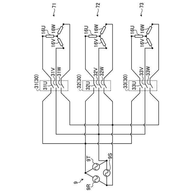 図7は、第1実施形態に係る三相交流電源とスイッチユニットと電気ヒータとを示す結線図である。