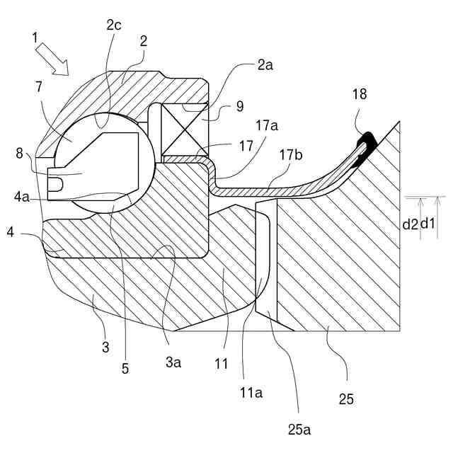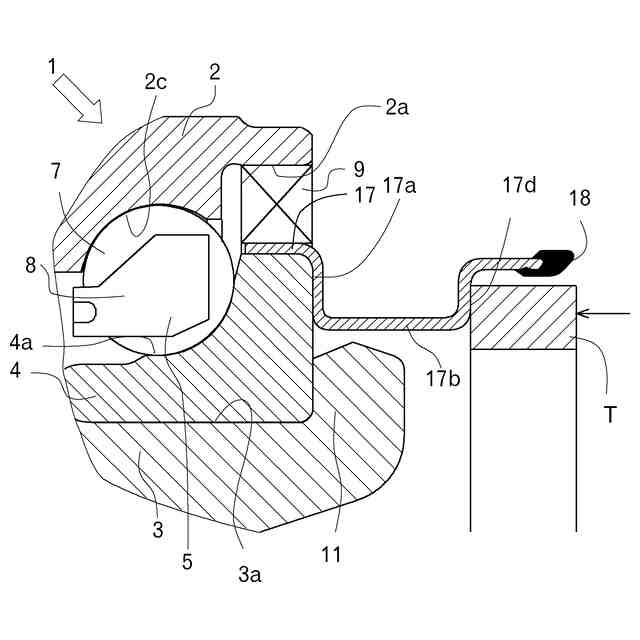 また、加締部の外径には、内方部材に圧入される円筒部と、この円筒部から径方向外方に延びる立板部とからなるスリンガが設けられている。スリンガの円筒部の圧入管理方法として、内輪の端面にスリンガの芯金の段差を当接させることで内輪端面とスリンガとの位置合わせを行いつつ圧入する方法が公知となっている。
