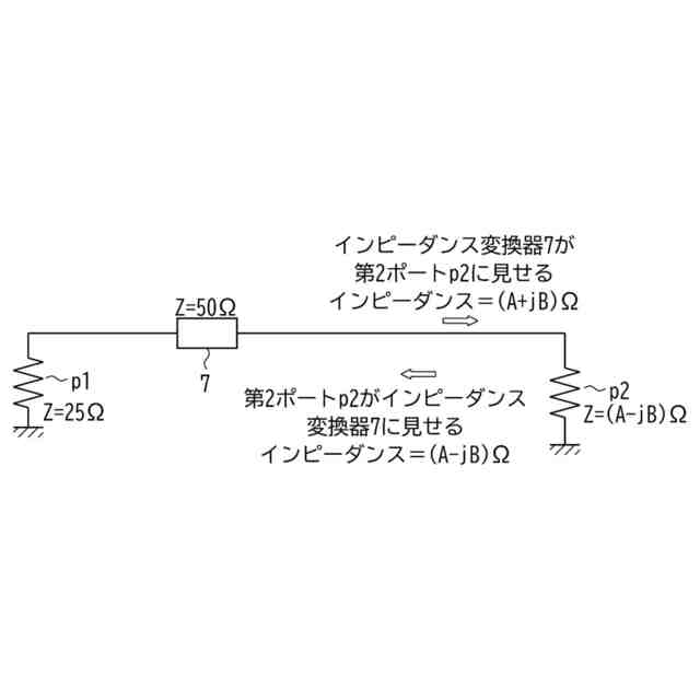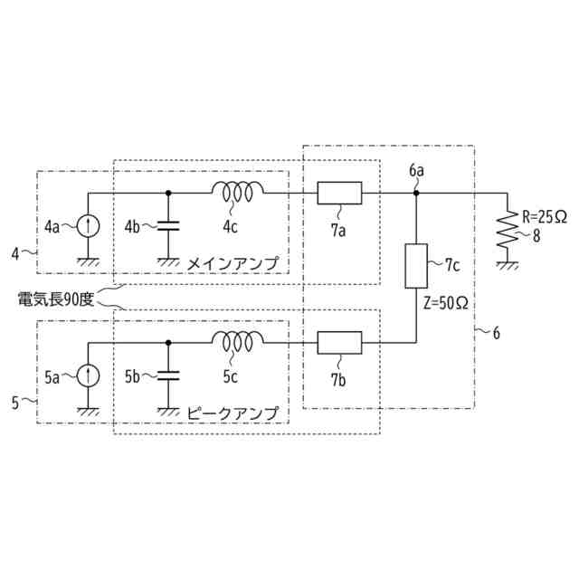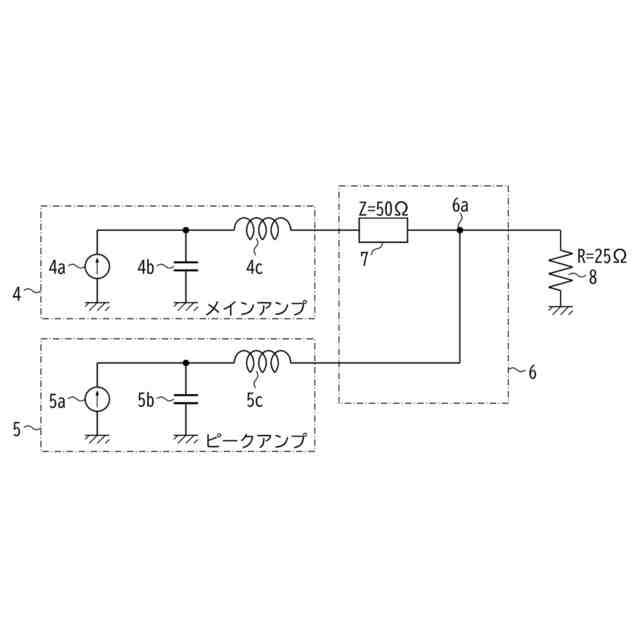 高周波入力信号の振幅に応じて動作させるアンプの数を動的に切り替えるドハティ増幅器が知られている。ドハティ増幅器は、メインアンプとピークアンプで構成される。トランジスタで設計したメインアンプ及びピークアンプなどは、ドハティ増幅器などのパワーアンプが見せるインピーダンスはスミスチャート上で時計回りのインピーダンス軌跡を描くため、高効率かつ広帯域の特性を得るには、パワーアンプの出力にスミスチャート上で反時計回りのインピーダンス軌跡を実現する負荷を接続する必要がある。