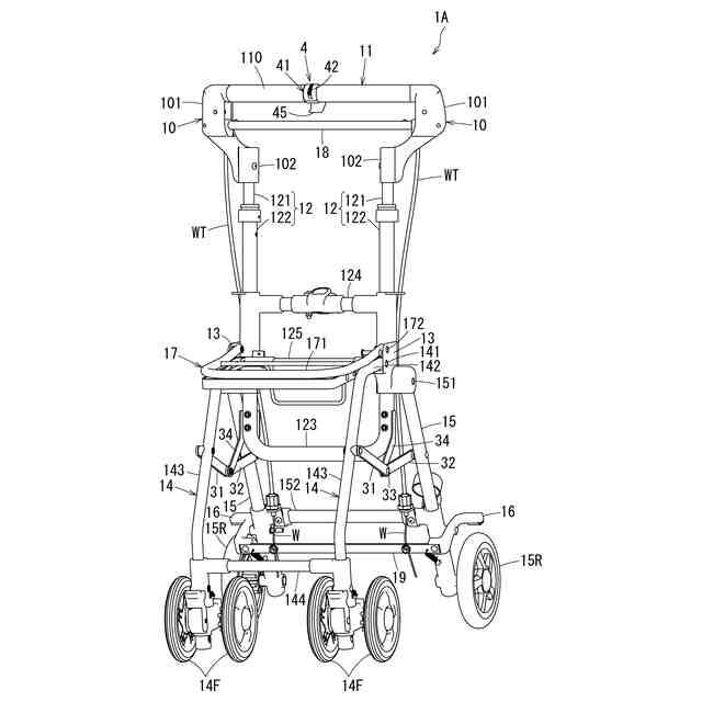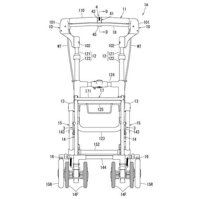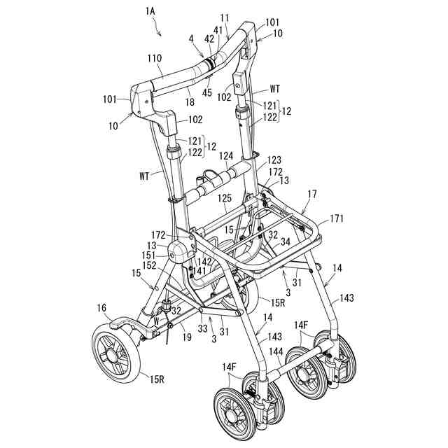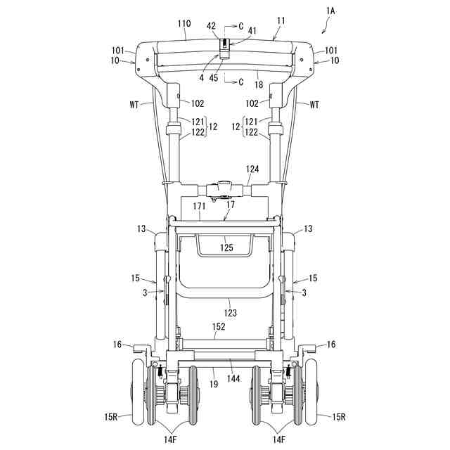 また、手押し車は、操舵部に対し離間する離間位置に設けられた制動レバーを備えたものもあり、この制動レバーを操舵部に接近する制動位置へ向かって操作することで、前後両輪のうちの左右の後輪を制動するようにしている(特許文献1参照)。