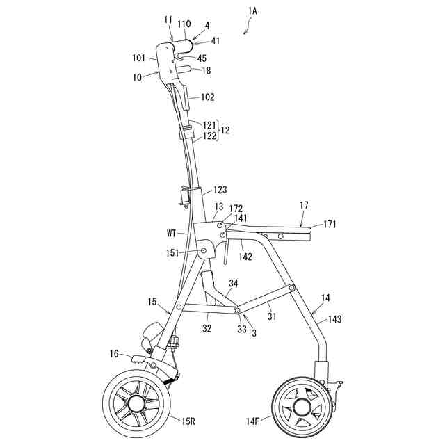 前記摺動体には、前記制動レバーの制動位置で前記左右の後輪に対し圧接するブレーキパッドがワイヤーを介して連結され、前記制動レバーが前記制動位置へ向かって操作された際に前記スライダも前記操舵部に対し接近する一方、前記制動レバーが前記離間位置に離間している際に前記スライダも前記操舵部に対し離間するようになっているとともに、
