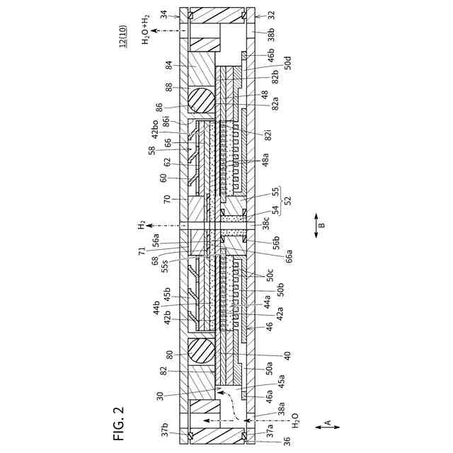 電解質膜がプロトン伝導体である場合、カソード極では、電子、プロトン及び酸素が生成され、アノード極では水素が生成される。水素は酸素に比べて高圧にされる。電解質膜がアニオン伝導体である場合、カソード極では、水素及び水酸化物イオンが生成され、アノード極では酸素、水及び電子が生成される。酸素は水素に比べて高圧にされる。このように、水電解装置では、第1電極又は第2電極の一方に高圧ガスが生じる。