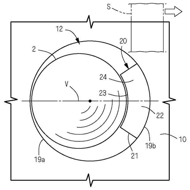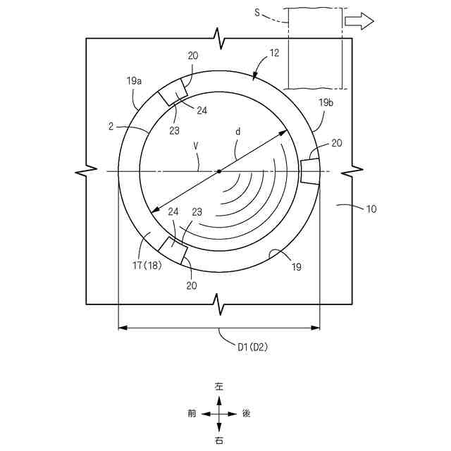平面視において、通孔(12)の孔中心を通る仮想線(V)を想定したとき、