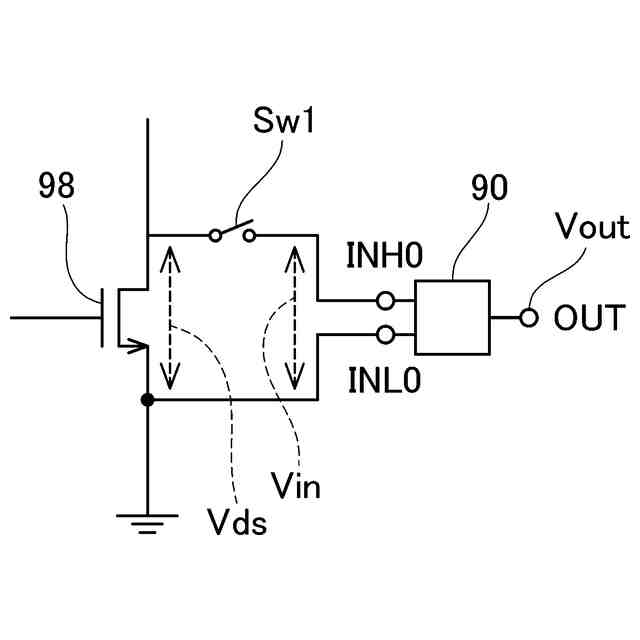図1に示す電圧変換回路90は、パワー半導体素子である電界効果トランジスタ98のドレイン電圧Vds(すなわち、ドレイン-ソース間の電圧)を検出する。電圧変換回路90は、入力端子INH0、入力端子INL0、及び、出力端子OUTを有している。入力端子INH0は、スイッチSw1を介して電界効果トランジスタ98のドレインに接続されている。入力端子INL0は、電界効果トランジスタ98のソースに接続されている。電圧変換回路90は、入力端子INH0と入力端子INL0の間の電圧(以下、入力電圧Vinという)を増幅した出力電位Voutを出力端子OUTに出力する。スイッチSw1がオンすると、入力電圧Vinは、ドレイン電圧Vdsと一致する。