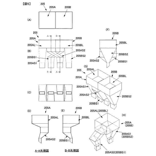また、生産性を高めるために、包装袋P16Aと包装袋P16Bをそれぞれ2列で生産する場合には(図9参照)、図10に示したような構成のホッパー105(105A及びホッパー105B)が必要とされる。
