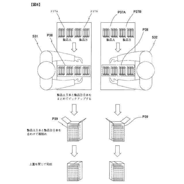 なお、図9、図11において、符号P17A、P17Bは製品搬出箱114A、114Bに貯留された包装袋を示し、符号P18A、P18Bは作業者により計数されて所定個数だけ取り出された一群の包装袋(製品)を示している。なお、図11では、5個を一群とする包装袋P18Aと、同じく5個を一群とするP18Bと、を、作業者が共通の(一つの同じ)箱に詰めて箱詰製品P19を完成させている。