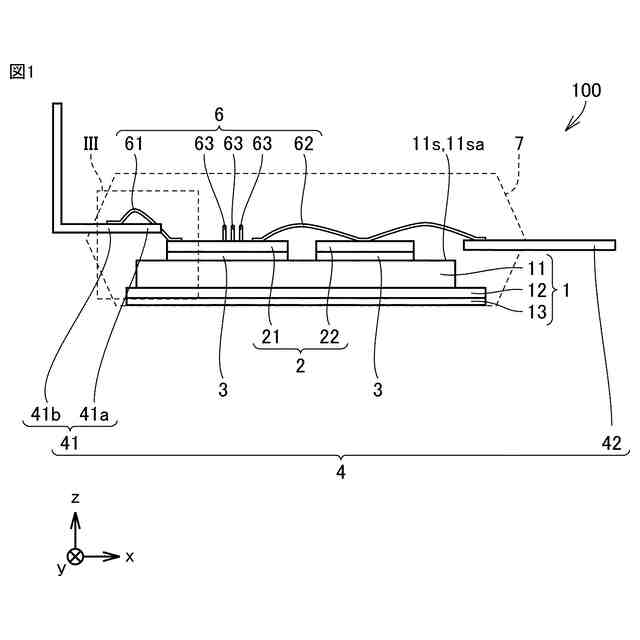 前記基材からみて前記半導体素子より遠い位置に配置されている端子と、
