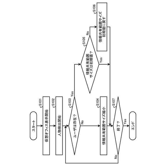 【解決手段】仮想空間制御システム1が備える制御部は、情報端末装置10の表示画面の前における情報端末装置10のユーザの存在を検出し、ユーザの存在有無に基づいて、ユーザに対応したアバターの周囲における情報共有範囲の形態を変更する。