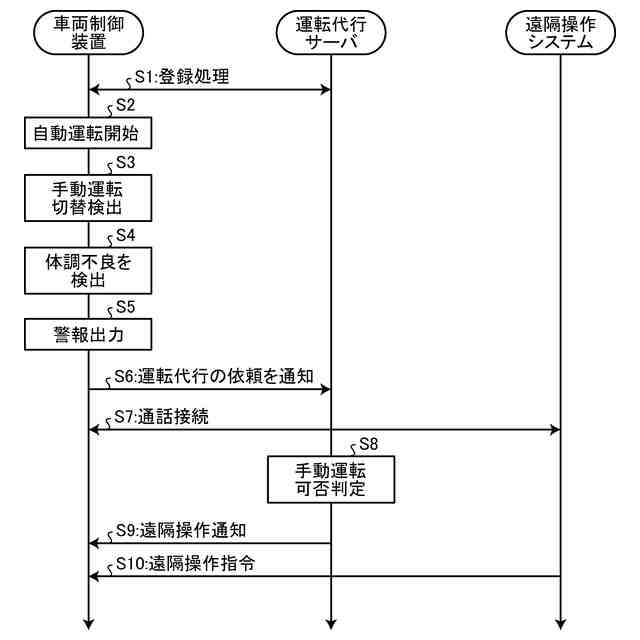 本発明によれば、運転者の体調が悪くて運転できない場合でも自動運転から手動運転に切り替えて運転代行者が遠隔で運転操作を代行する。このため、搭乗者が運転者の1名であっても自動運転から手動運転への切り替えを確実に行うことができる。