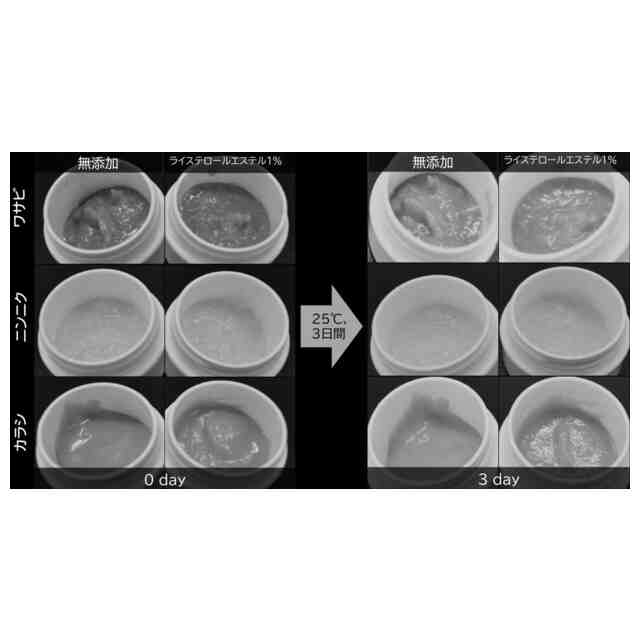 図3は、3種類のペースト状薬味において、ライステロールエステルの添加の有無による25℃で3日間保存したときの見た目を示す写真である。