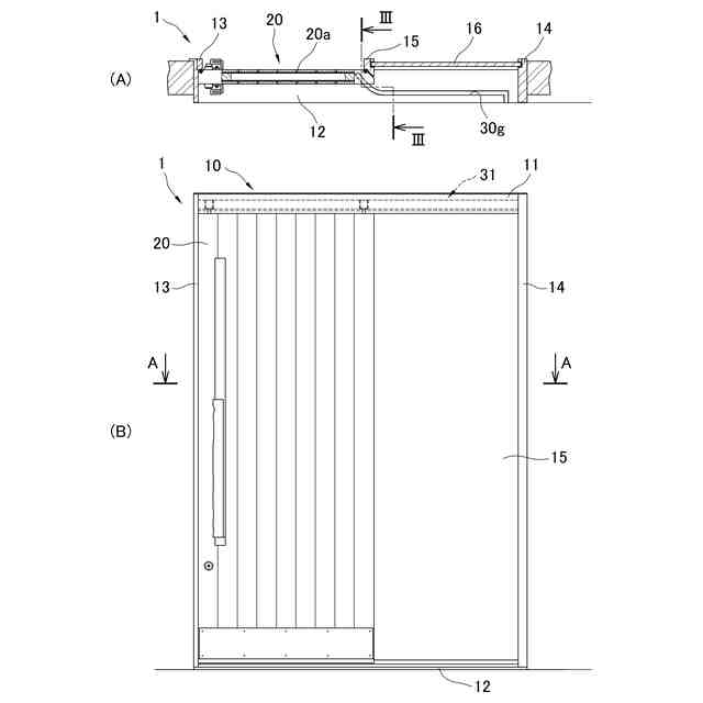 他の実施形態の引き戸1の扉20を閉じた状態の概略説明図であって、(A)は(B)のA-A線断面図であり、(B)は概略正面図である。