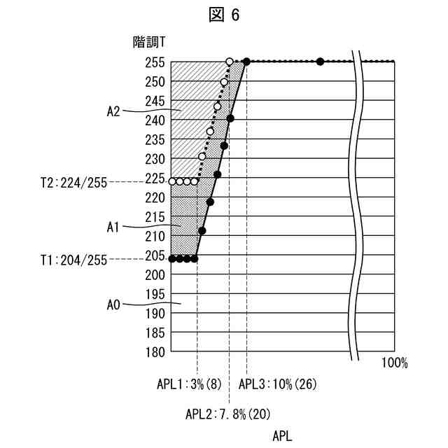 APLと輝度の関係を表すAPL輝度カーブの一例を表すグラフである。