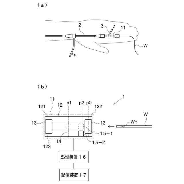 【解決手段】後端部122から先端部121まで延在するルーメン123を形成した筒状体12と、後端部122に配置された磁石13と、先端部121と後端部122との間の第1位置p1に配置された第1磁気センサ14と、第1磁気センサ14から取得したデータを処理する処理装置16と、を備える。磁石13は、磁性体を含むワイヤWがルーメン123に進入するときに、ワイヤWの一部であるターゲット領域を着磁させる。第1磁気センサ14は、ターゲット領域Wtが第1位置p1に配置されたときにターゲット領域Wtの第1着磁状態s1を検出する。処理装置16は、第1着磁状態s1に基づいて、ターゲット領域Wtの回転角θ1を算出する回転角算出部161を含む。