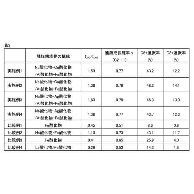 FT反応用触媒の評価指標として、連鎖成長確率αが挙げられる。連鎖成長確率αが高いほど炭素鎖の長い炭化水素を得られる。特許文献3には、FT反応を利用して合成ジェット燃料を製造する方法が開示されている。ジェット燃料のような炭素数の多い炭化水素(例えば、炭素数5以上の炭化水素)を合成する場合、連鎖成長確率αが高い触媒が求められる。