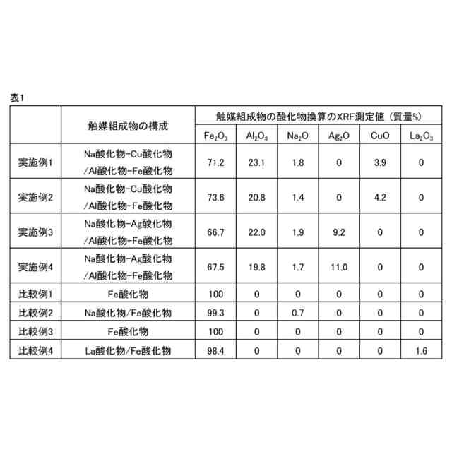 [5]成分(a)が、Feを含む酸化物から選択され、成分(b)が、Naを含む酸化物、Na炭酸塩及びNa硝酸塩から選択される、[3]又は[4]に記載の触媒組成物。